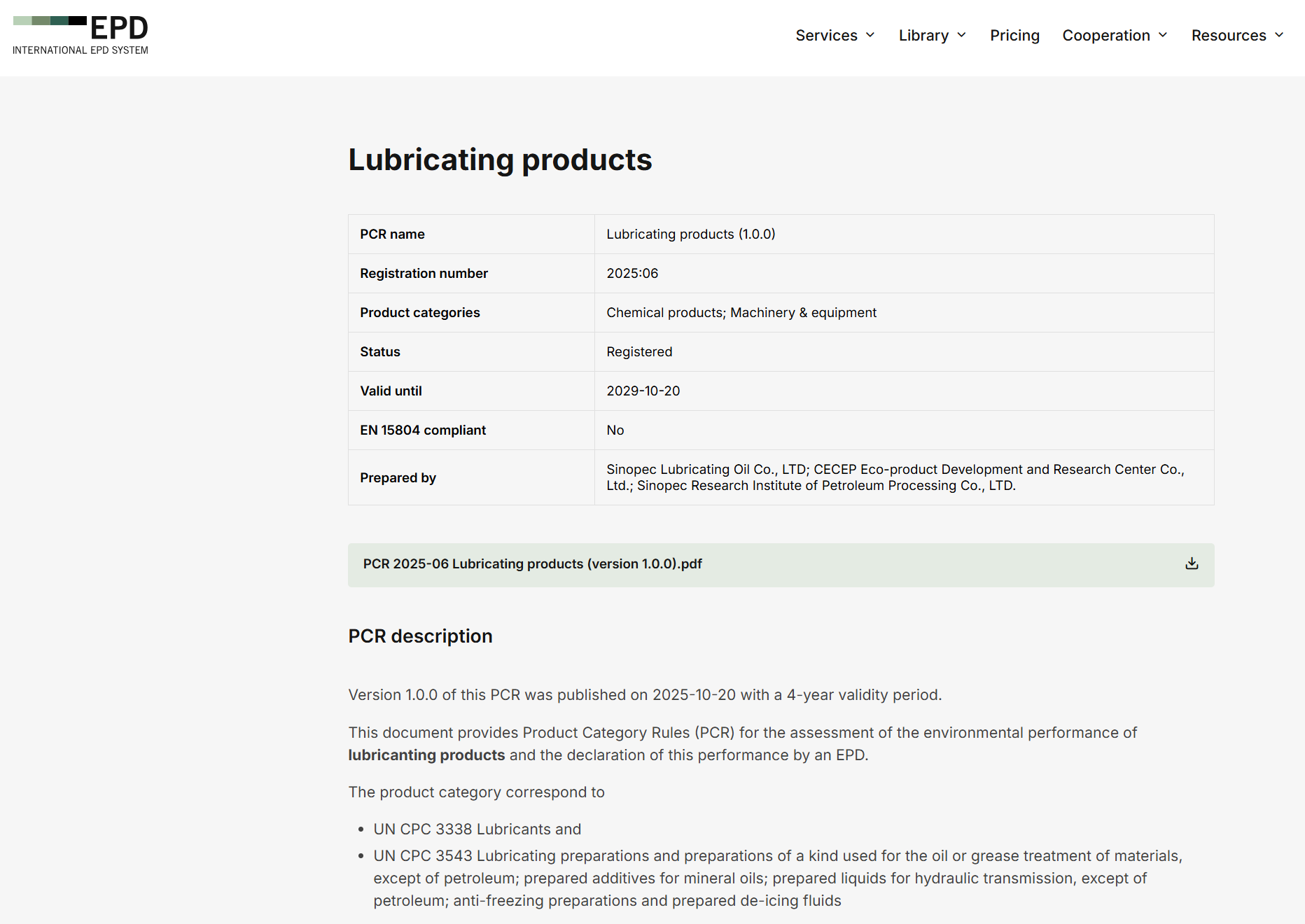 近日,国际首个《Product Category rules(PCR)for Lubricating Products》,即《润滑产品类别规则》主PCR,版本V1.0.0在国际EPD平台(International EPD system,IES)正式发布,标志着中国在润滑剂这一重要工业细分领域的国际标准制定中实现了“零的突破”,为全球润滑剂行业绿色低碳发展提供了至关重要的方法学标准框架。